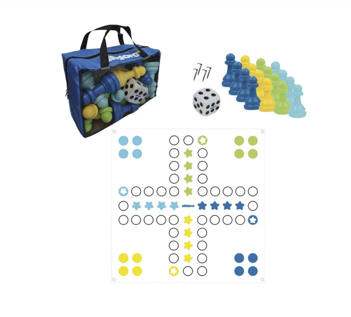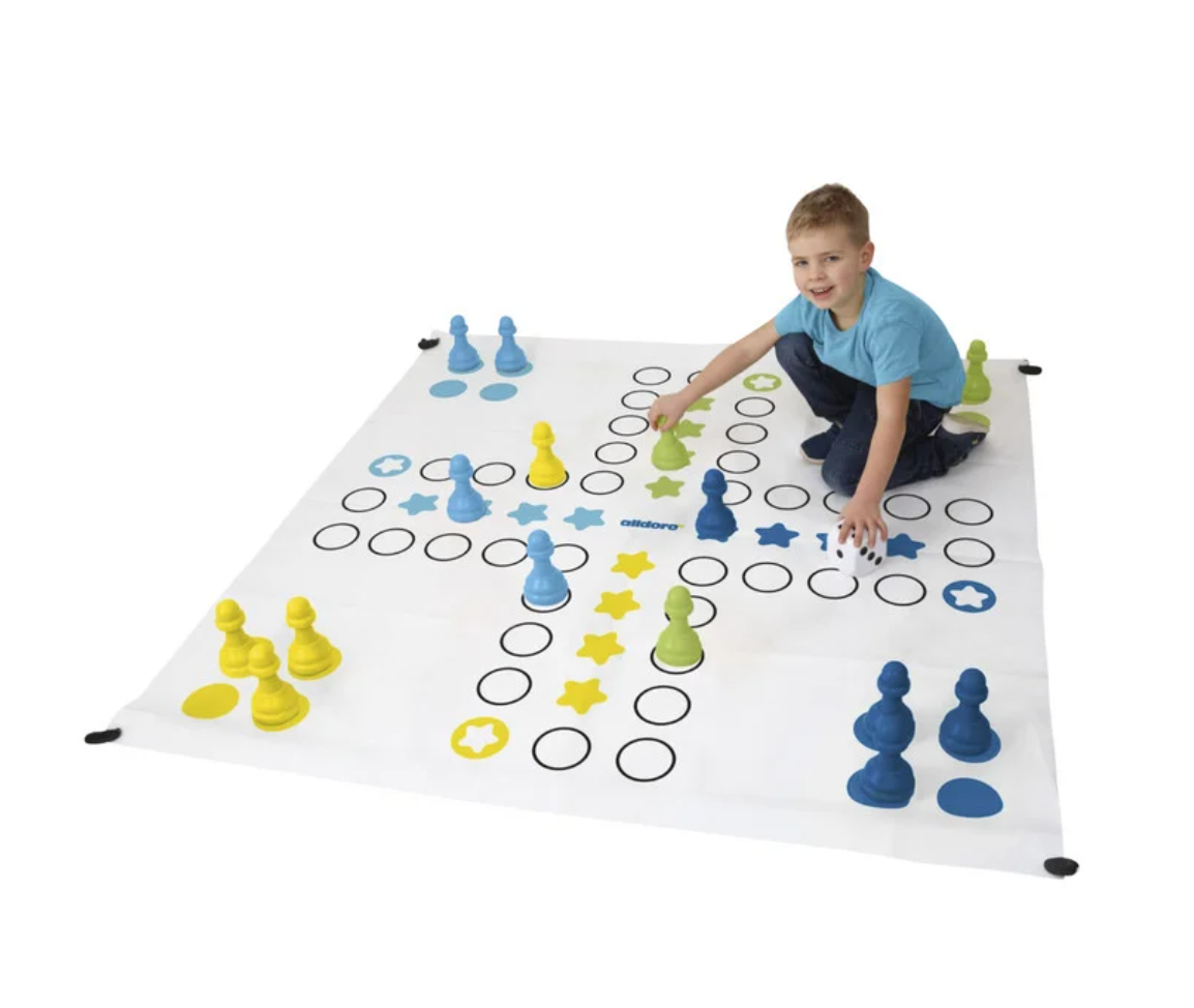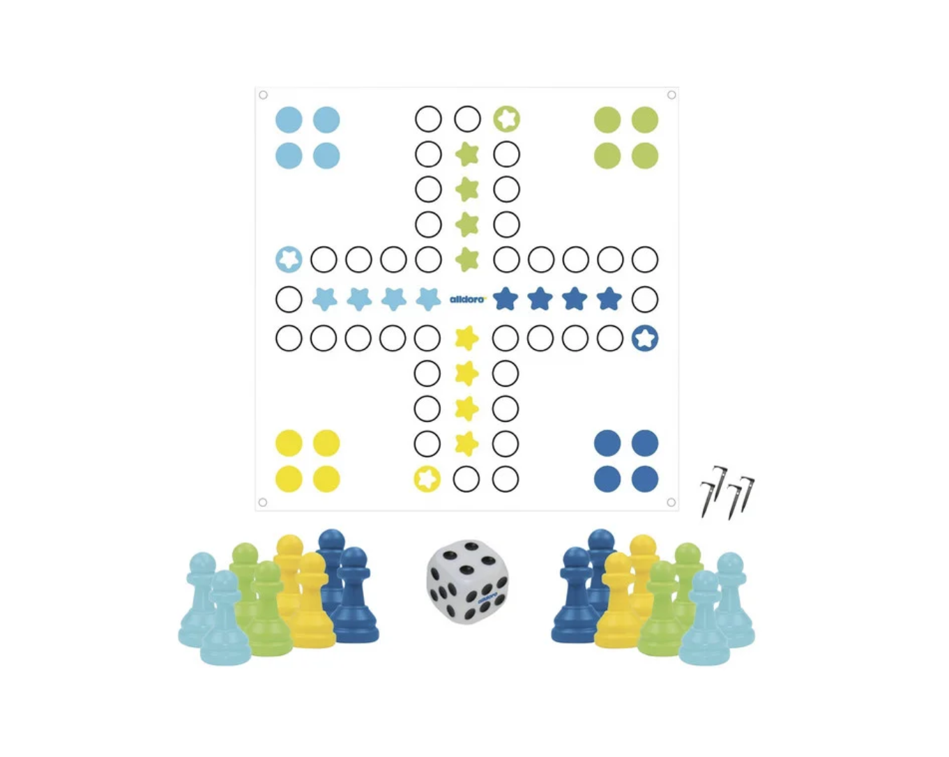 Im Set mit dem XXL-Ludo-Spiel hat man eine schöne Beschäftigung auf jedem Event.Auf einer Fläche von 150×150 cm können bis zu 4 Kinder fabelhaft gleichzeitig spielen. Aufgrund der strapazierfähigen Spielfläche kann selbst bei Wind und Wetter gespielt werden. Dazu müssen einfach die 4 Haken, die im Lieferumfang inbegriffen sind, an der Matte befestigt werden.