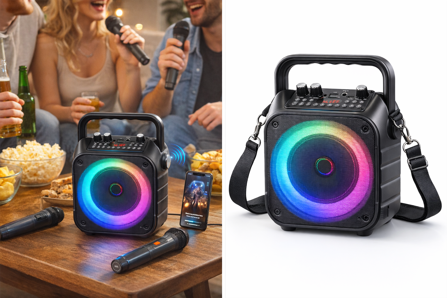 Der leistungsstarke Akku ermöglicht mehrere Stunden Musik- und Karaoke-Spaß ohne Unterbrechung. Damit eignet sich das Gerät nicht nur für Feiern zu Hause, sondern auch für Ausflüge, Reisen oder spontane Events unterwegs. Durch sein leichtes, tragbares Design kann die Karaoke-Maschine flexibel eingesetzt und einfach transportiert werden.