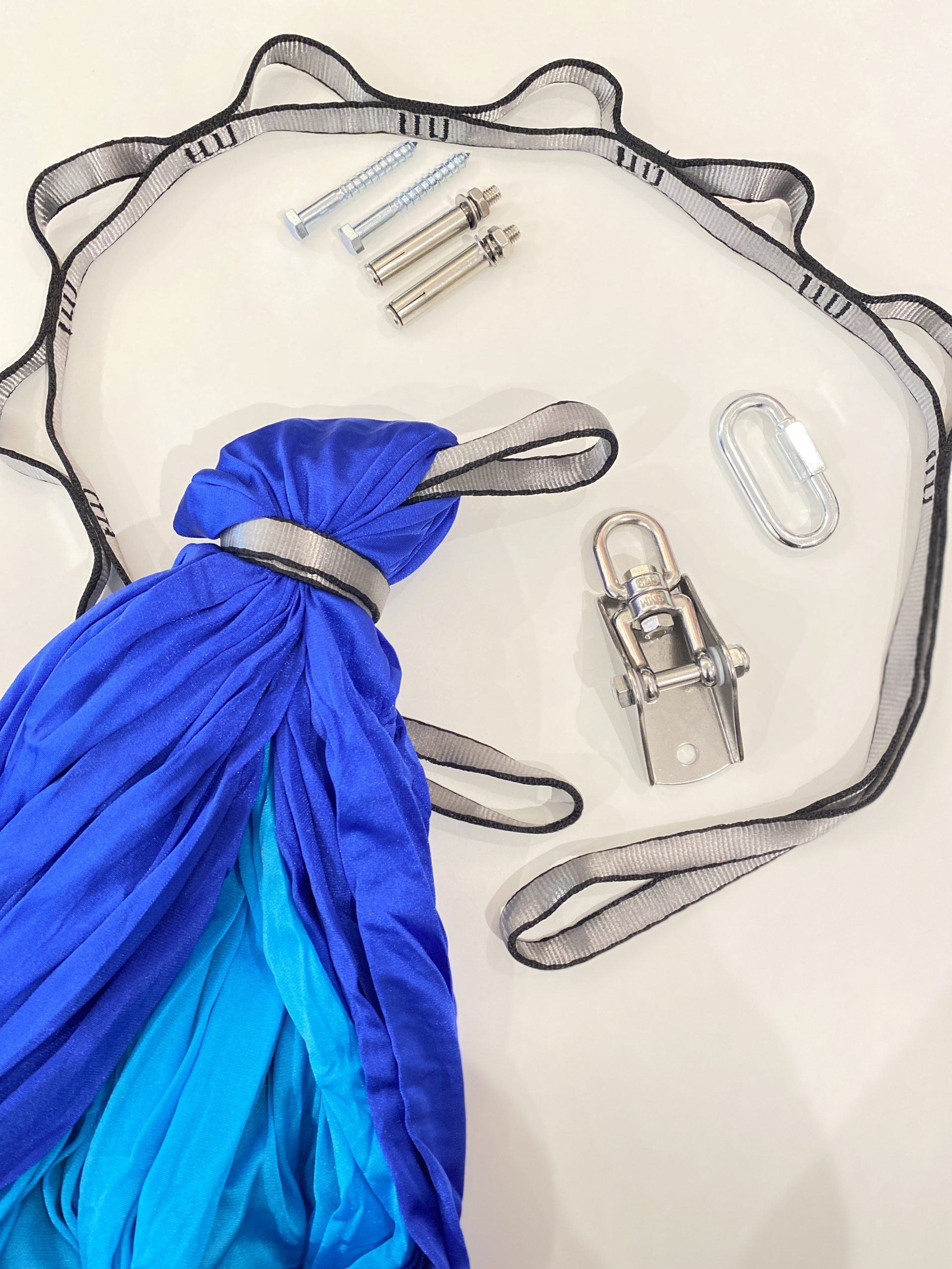 Therapieschaukel (Blau), Gänseblümchenkette, Karbiner, Verlängerungsband, Anleitung